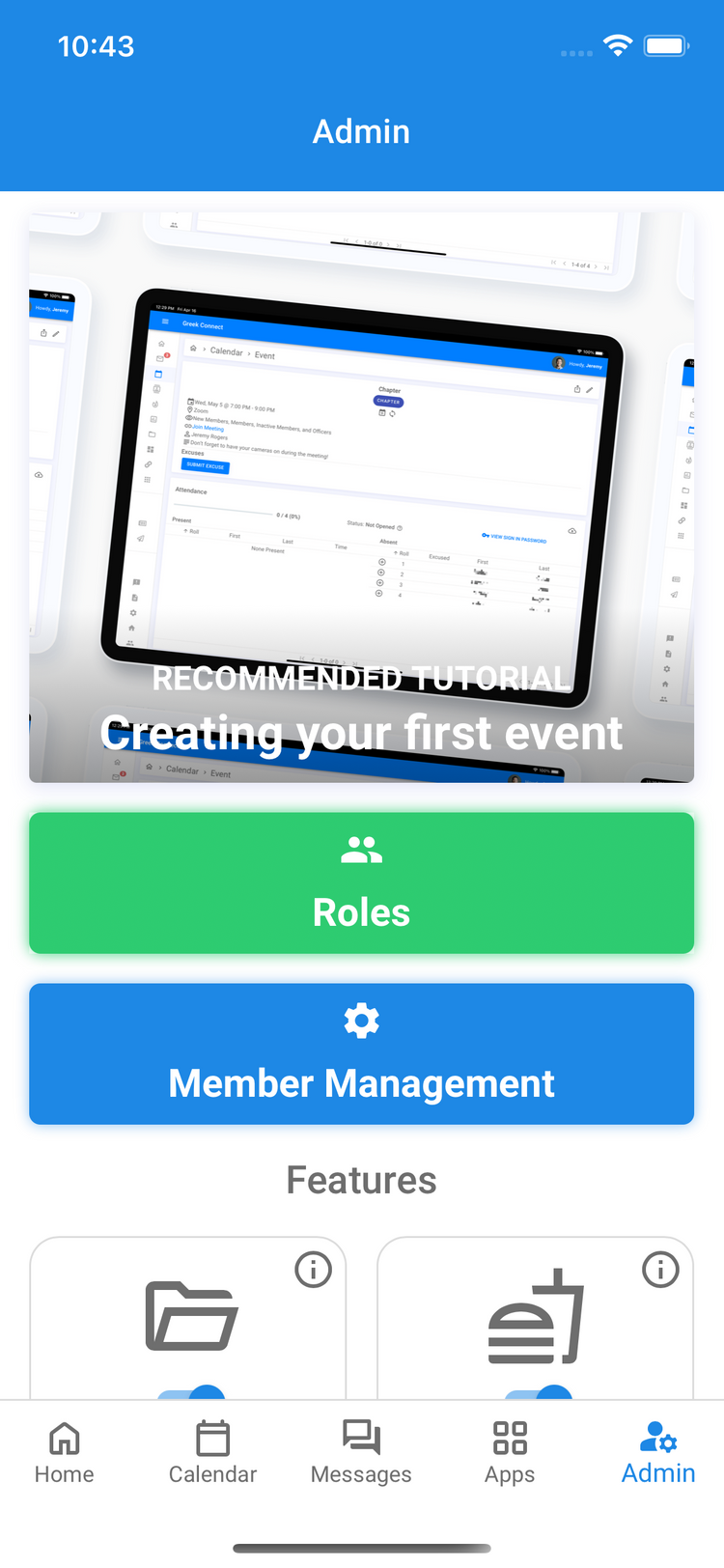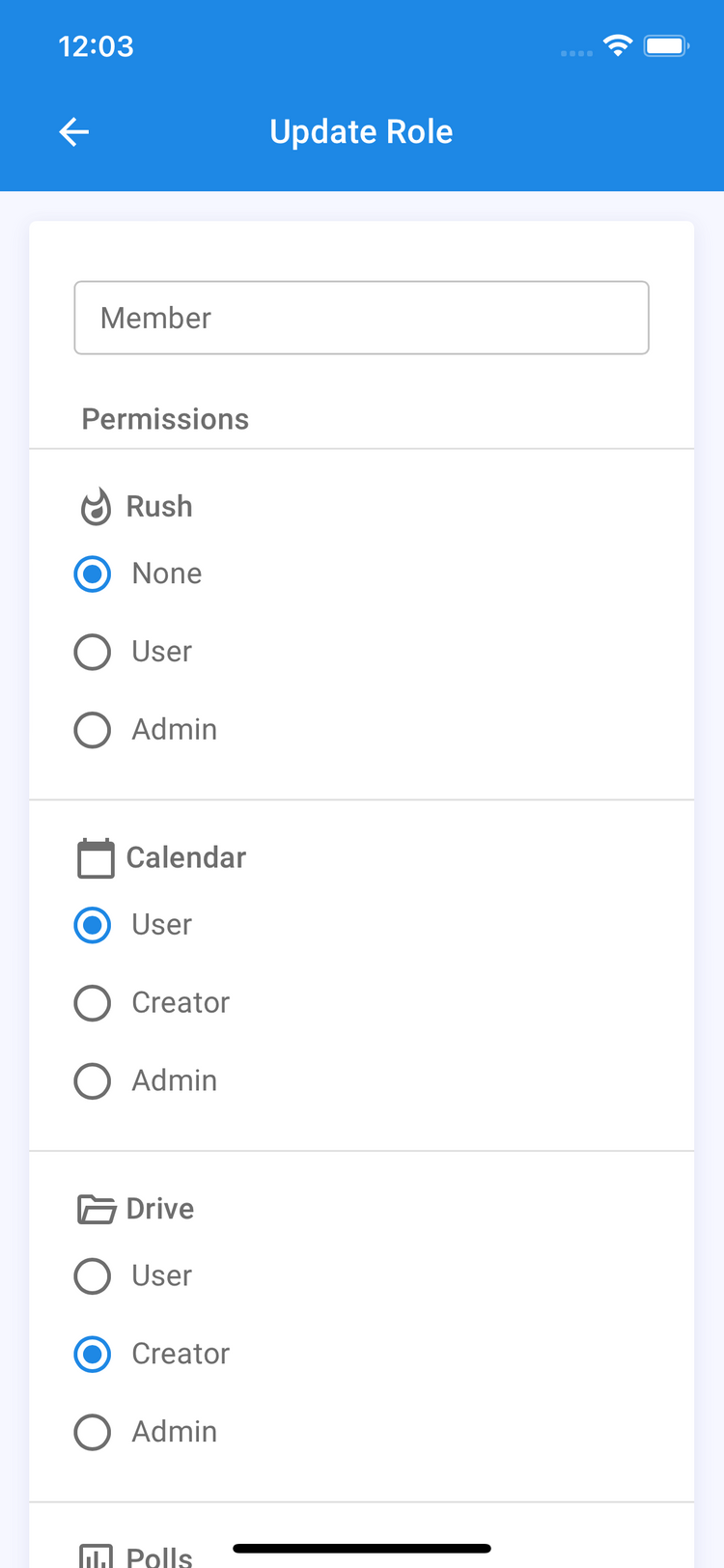 Chapter officers can create roles to handle different groups of members’ permission needs. Members in committees or those in charge of specific features such as meals can be given partial admin so that they have the permissions needed to manage their associated section, without being able to edit other parts of the app.