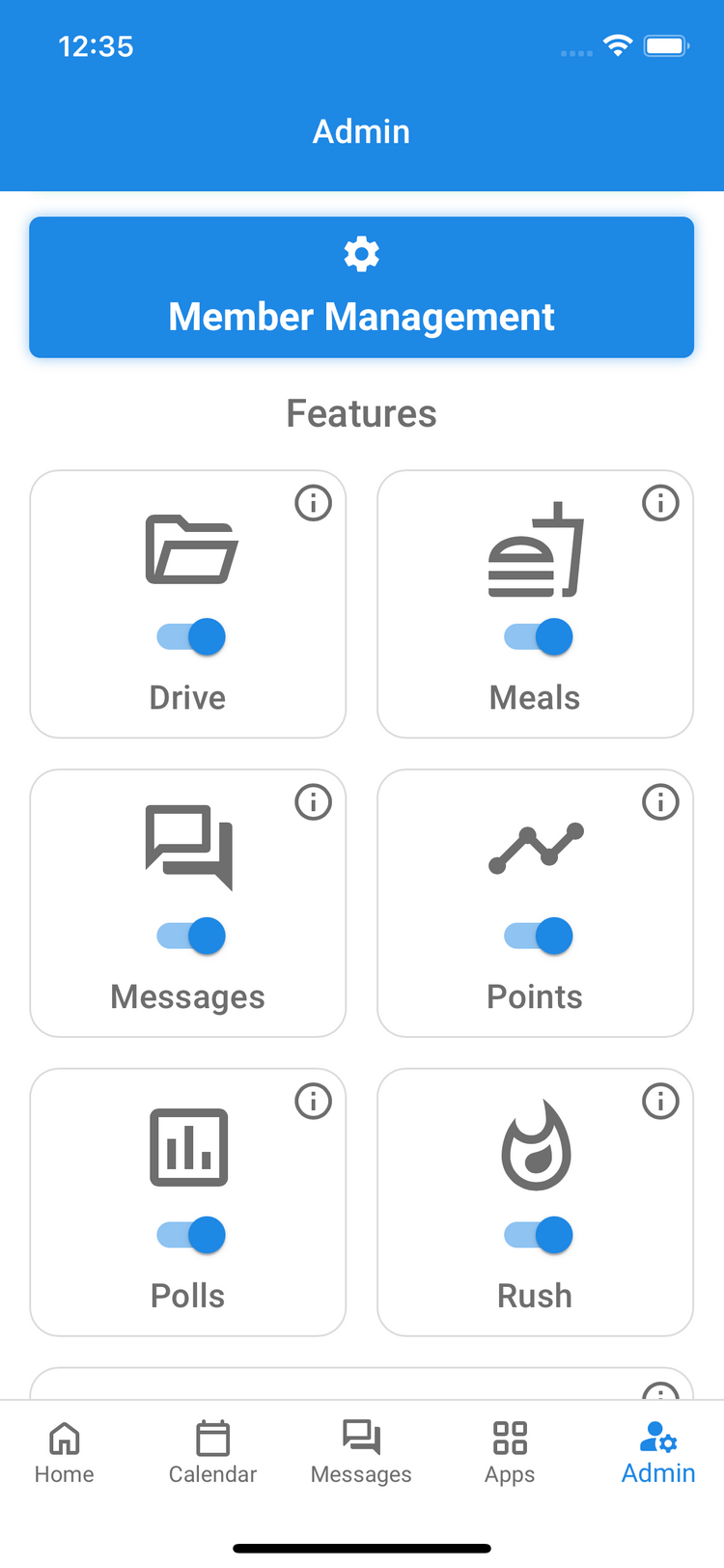 Officers can toggle different features on the app, such as drive, points, rush, and meal plan, to ensure that only the used features are shown to members.