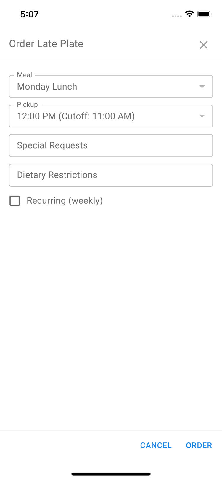 Members can request late plates for the meals that they’re unable to attend, and can mark them as recurring to automatically request them in future weeks. They can also write in any special requests or modify their default dietary restrictions.