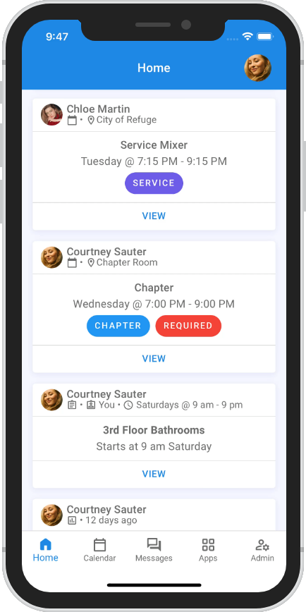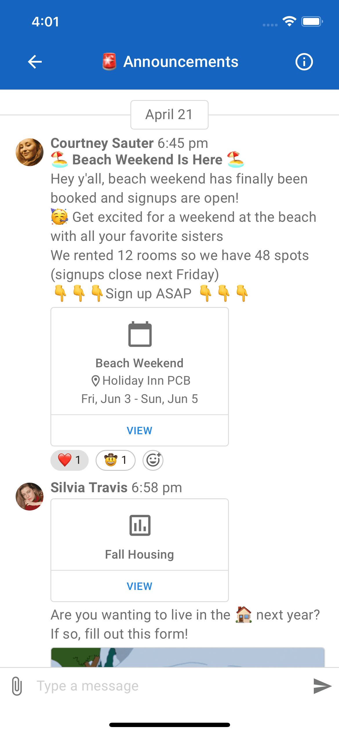 Your chapter's officers can easily create conversations for any situation. Whether it is a date night, pledge class, or an announcements group for everyone, admins can quickly and easily make and manage the conversation. Also, Admins can set permissions for conversations as well, toggling the ability to send messages or react to messages with emojis.